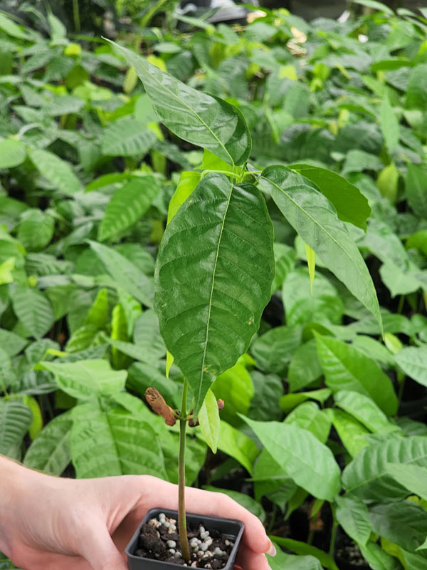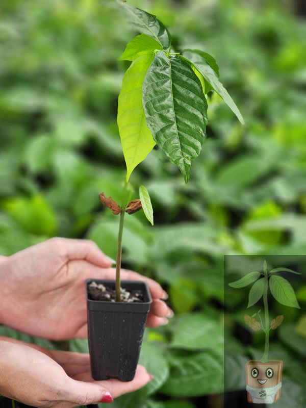 Real Chocolate Tree (theobroma cacao) – Grow your own Chocolate at home! A small, tropical evergreen, up to 25 feet, with thick, oblong-oval, leaves. In a 24” container, kept trimmed to 6′ this tree often produces 5 to 10 pods annually. The cacao “beans” are produced in large, angular orange-reddish capsules, up to a foot long and 4 inches diameter. The capsule rind is thick, hard and leathery. The capsules grow along the trunk and main branches. The beans, or seeds, about an inch across, range from 20 to 40 per capsule, and are embedded in an acid, fleshy pulp. After removal from the capsule, the beans are washed or fermented to remove the mucilaginous pulp. Chocolate is the sweetened or unsweetened product of the roasted and ground beans, with most of the fat retained.