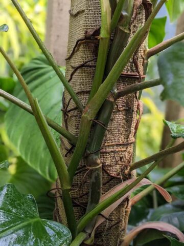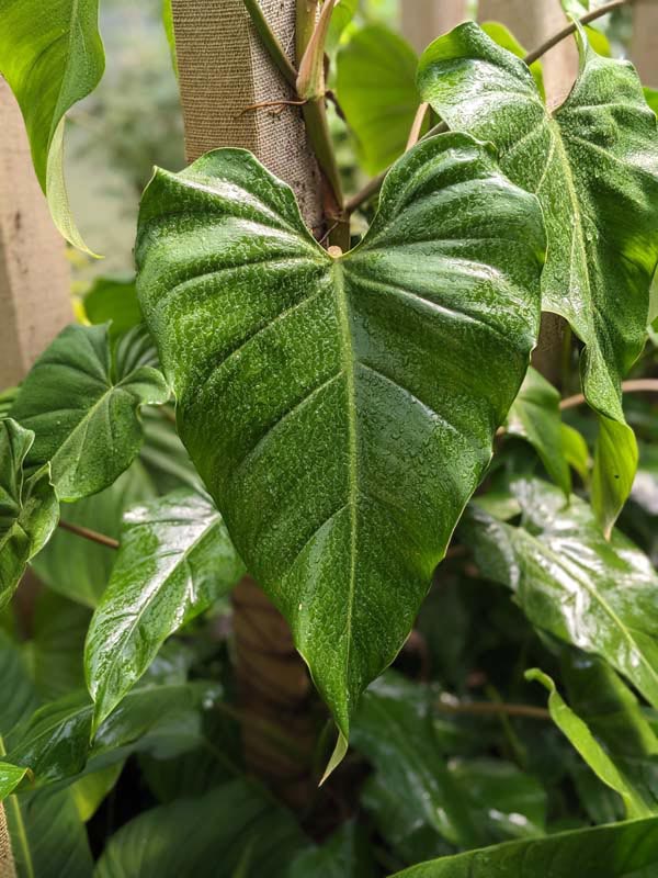 Philodendron are very easy to grow tropical plants that require little care indoors or out. Like other aroids, many species of Philodendron can be grown as houseplants, or outdoors in mild climates. They thrive in moist soils with high organic matter and grow best when provided with a mossy post or burlap wrapped pole to climb. Philodendron plants can be grown in pots, hanging baskets or outdoors as a ground cover or beautiful tree wrap. Indoors plants thrive at temperatures between 65°-90°F and in lower light conditions than other house plants. In the ground or up an arbor, Philodendrons get big and are often unrecognizable from their potted juvenile state. They add a wonderfully tropical accent to any well-lit space or cascading from your favorite hanging planter. In very cold zones a containerized Philodendron can be brought inside for the winter months. Be sure to avoid frost and freezing temperatures.
