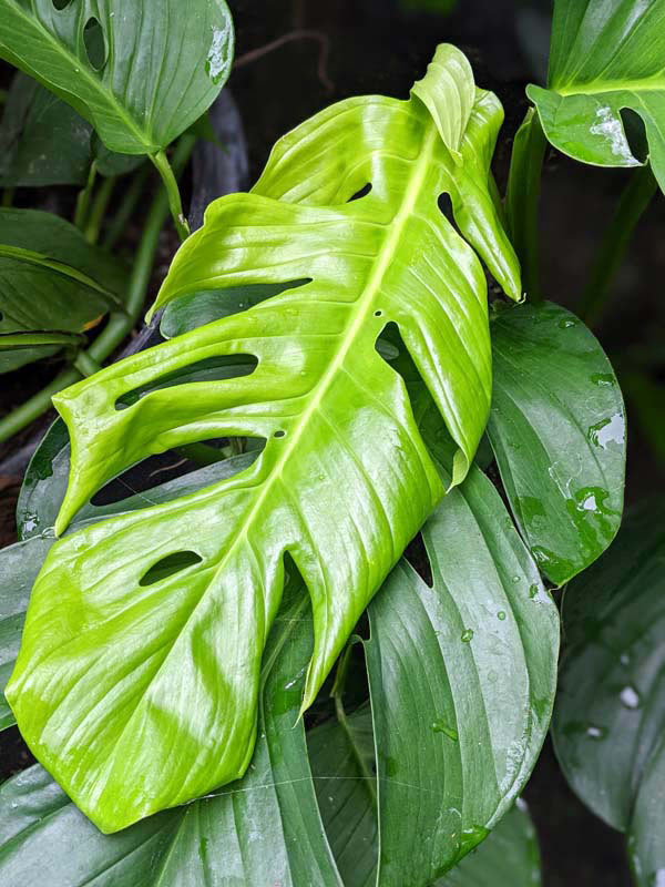 Monstera are very easy to grow tropical plants that require little care indoors or out. Like other aroids, many species of Monstera can be grown as houseplants, or outdoors in mild climates. They thrive in moist soils with high organic matter and grow best when provided with a mossy post or burlap wrapped pole to climb. Monstera plants can be grown in pots, hanging baskets or outdoors as a ground cover or beautiful tree wrap. Indoors plants thrive at temperatures between 65°- 90°F and in lower light conditions than other house plants. In the ground or up an arbor, Monsteras get big and are often unrecognizable from their potted juvenile state. They add a wonderfully tropical accent to any well-lit space or cascading from your favorite hanging planter. In very cold zones a containerized Monstera can be brought inside for the winter months. Be sure to avoid frost and freezing temperatures.