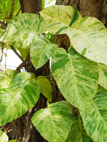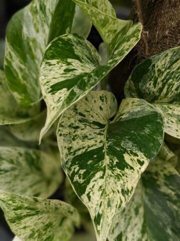 Marble Queen Pothos is one of our favorite plants here at the nursery, coloration will vary with size, sunlight and soil conditions. When allowed to climb this plant gets big. Leaves can reach 22 inches or more in width and split like the famous Hawaiian Gold Queen. Relatively short node spacing makes it a great choice for indoor growing in hanging baskets or on your sunny windowsill. Please note that leaves will vary on the degree of variegation and some side shoots may have minor variegation. Simple Trick: To maintain a well variegated plant simply trim the unvariegated vines just after the last variegated leaf and the new shoots should be variegated.