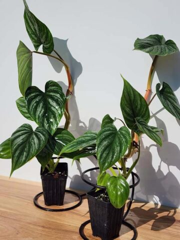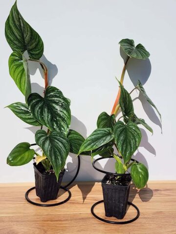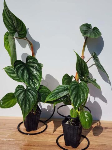 Philodendron are very easy to grow tropical plants that require little care indoors or out. Like other aroids, many species of Philodendron can be grown as houseplants, or outdoors in mild climates. They thrive in moist soils with high organic matter and grow best when provided with a mossy post or burlap wrapped pole to climb. Philodendron plants can be grown in pots, hanging baskets or outdoors as a ground cover or beautiful tree wrap. Indoors plants thrive at temperatures between 65°-90°F and in lower light conditions than other house plants. In the ground or up an arbor, Philodendrons get big and are often unrecognizable from their potted juvenile state. They add a wonderfully tropical accent to any well-lit space or cascading from your favorite hanging planter. In very cold zones a containerized Philodendron can be brought inside for the winter months. Be sure to avoid frost and freezing temperatures.