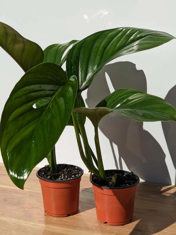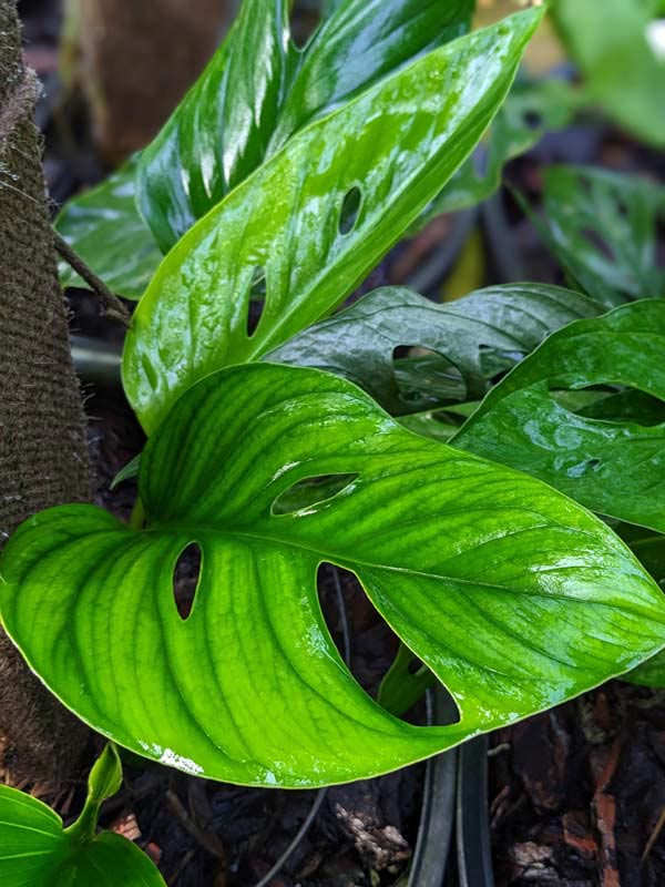 Monstera are very easy to grow tropical plants that require little care indoors or out. Like other aroids, many species of Monstera can be grown as houseplants, or outdoors in mild climates. They thrive in moist soils with high organic matter and grow best when provided with a mossy post or burlap wrapped pole to climb. Monstera plants can be grown in pots, hanging baskets or outdoors as a ground cover or beautiful tree wrap. Indoors plants thrive at temperatures between 65°- 90°F and in lower light conditions than other house plants. In the ground or up an arbor, Monsteras get big and are often unrecognizable from their potted juvenile state. They add a wonderfully tropical accent to any well-lit space or cascading from your favorite hanging planter. In very cold zones a containerized Monstera can be brought inside for the winter months. Be sure to avoid frost and freezing temperatures.