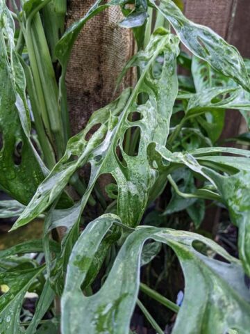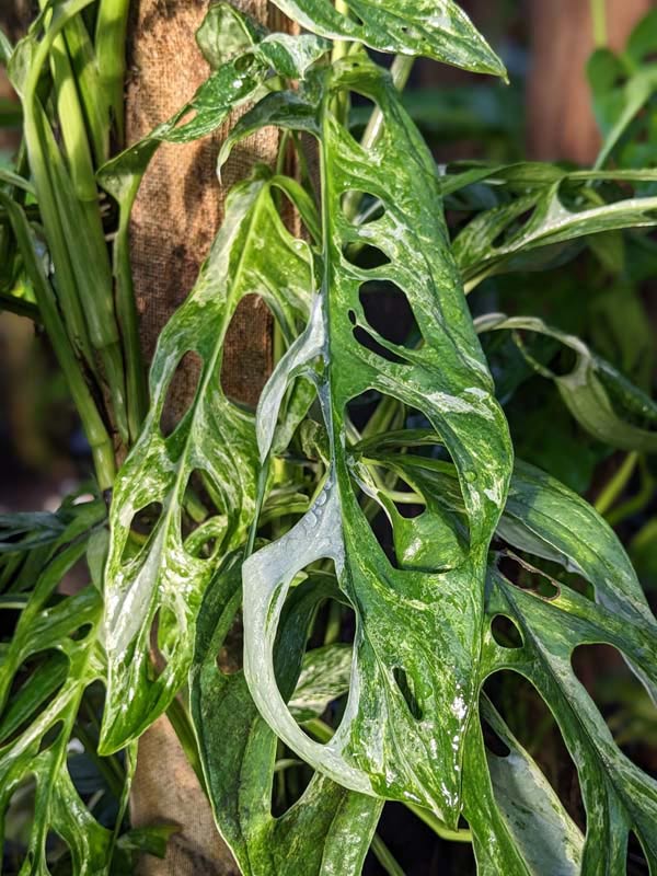 Monstera are very easy to grow tropical plants that require little care indoors or out. Like other aroids, many species of Monstera can be grown as houseplants, or outdoors in mild climates. They thrive in moist soils with high organic matter and grow best when provided with a mossy post or burlap wrapped pole to climb. Monstera plants can be grown in pots, hanging baskets or outdoors as a ground cover or beautiful tree wrap. Indoors plants thrive at temperatures between 65°- 90°F and in lower light conditions than other house plants. In the ground or up an arbor, Monsteras get big and are often unrecognizable from their potted juvenile state. They add a wonderfully tropical accent to any well-lit space or cascading from your favorite hanging planter. In very cold zones a containerized Monstera can be brought inside for the winter months. Be sure to avoid frost and freezing temperatures.