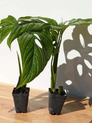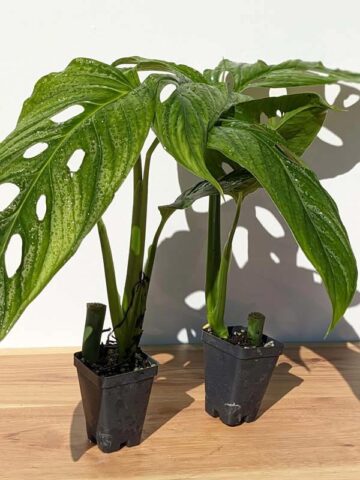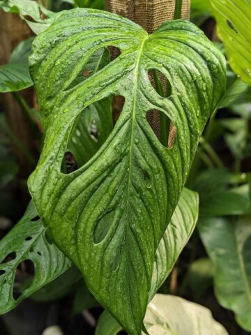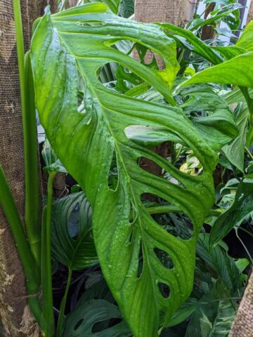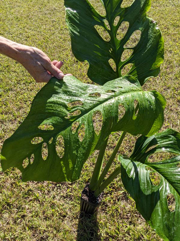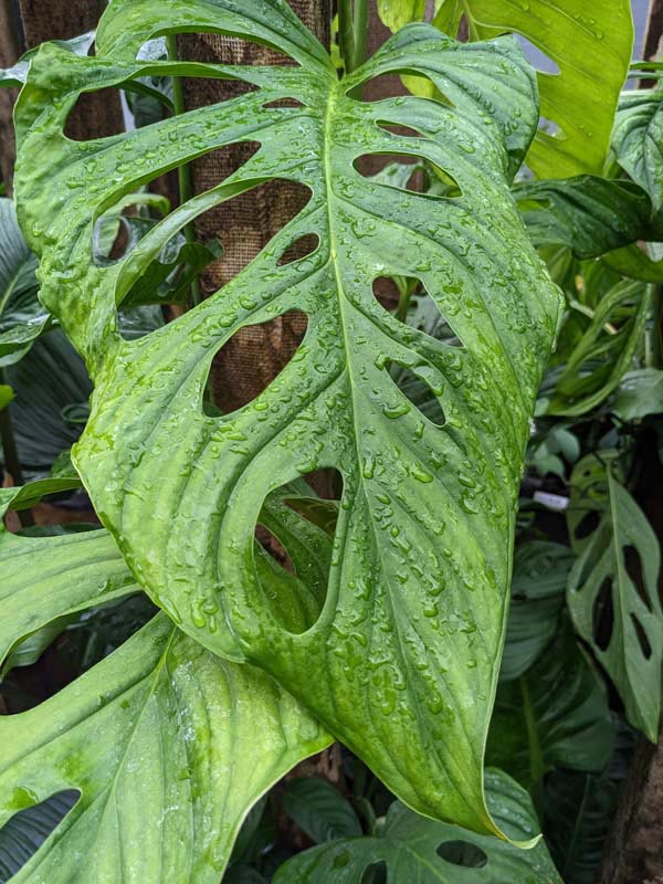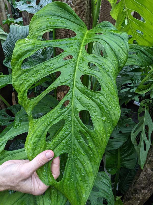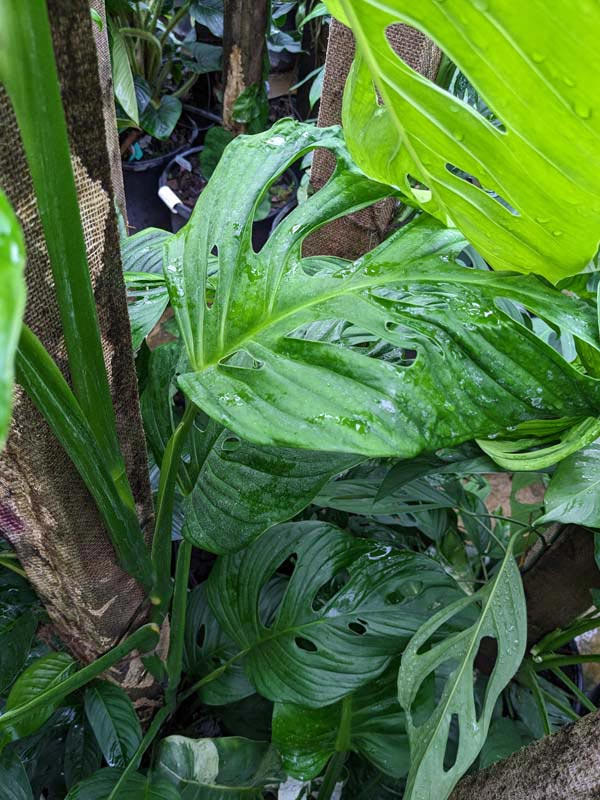 Monstera are very easy to grow tropical plants that require little care indoors or out. Like other aroids, many species of Monstera can be grown as houseplants, or outdoors in mild climates. They thrive in moist soils with high organic matter and grow best when provided with a mossy post or burlap wrapped pole to climb. Monstera plants can be grown in pots, hanging baskets or outdoors as a ground cover or beautiful tree wrap. Indoors plants thrive at temperatures between 65°- 90°F and in lower light conditions than other house plants. In the ground or up an arbor, Monsteras get big and are often unrecognizable from their potted juvenile state. They add a wonderfully tropical accent to any well-lit space or cascading from your favorite hanging planter. In very cold zones a containerized Monstera can be brought inside for the winter months. Be sure to avoid frost and freezing temperatures.