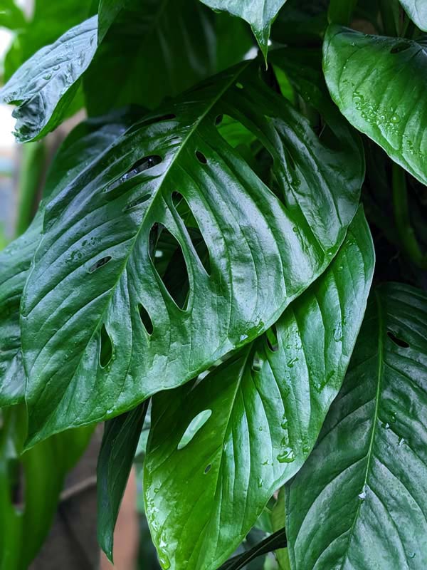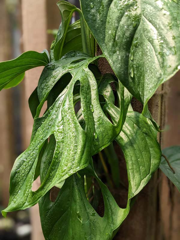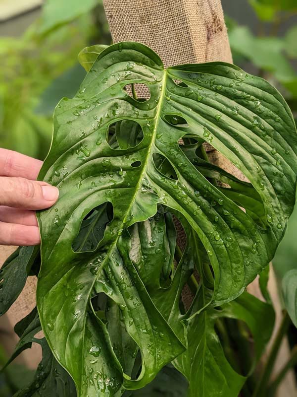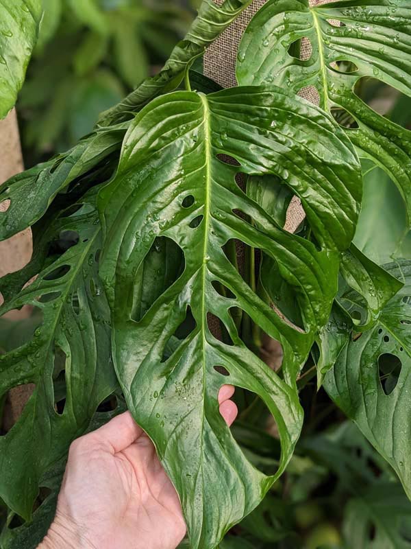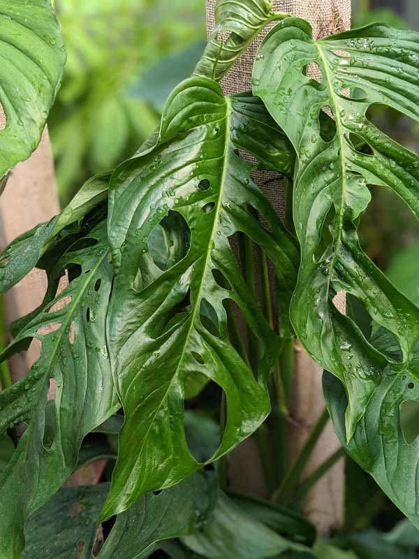 Monstera Obliqua Slovakia University Pavla Jozefa Šafárika Glossy Oblong rainforest green, leaves bigger than your hand, sport big and little fenestrations amid the deeply veined and puckered leaves. A Shorter node spacing combined with a short petiole give the vine its bushy appearance. Sizing on the fenestrations varies wildly, producing holes so large that they leave only a thread to form the leaf edge. This Monstera is very easy to grow and if allowed to climb or root into moss pole, the nodes will become shorter and the leaves larger. It is a very fast climber and has large, rich green leaves. These are very healthy, climbing tropical plants with well established root systems.