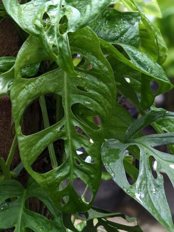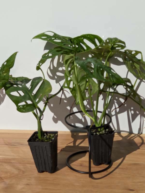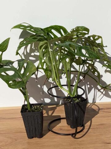 Monstera are very easy to grow tropical plants that require little care indoors or out. Like other aroids, many species of Monstera can be grown as houseplants, or outdoors in mild climates. They thrive in moist soils with high organic matter and grow best when provided with a mossy post or burlap wrapped pole to climb. Monstera plants can be grown in pots, hanging baskets or outdoors as a ground cover or beautiful tree wrap. Indoors plants thrive at temperatures between 65°- 90°F and in lower light conditions than other house plants. In the ground or up an arbor, Monsteras get big and are often unrecognizable from their potted juvenile state. They add a wonderfully tropical accent to any well-lit space or cascading from your favorite hanging planter. In very cold zones a containerized Monstera can be brought inside for the winter months. Be sure to avoid frost and freezing temperatures.