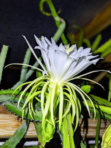 The fruits produced by Neitzel White Dragon Fruit are red with green tips in color with a white, delicious flesh inside that is edible and refreshing. Neitzel White is a wonderful mid-high yield, self pollinating variety, small in size weighing on average 0.3 – 0.7 lbs. Easily adapted to a variety of growing conditions and soils, this beautiful night blooming cactus produces fruit best when allowed to climb on a burlap wrapped totem, trellis or your favorite tree. The huge 10-16 inch round flowers are highly fragrant and beautiful in form, usually lasting just one night.