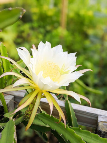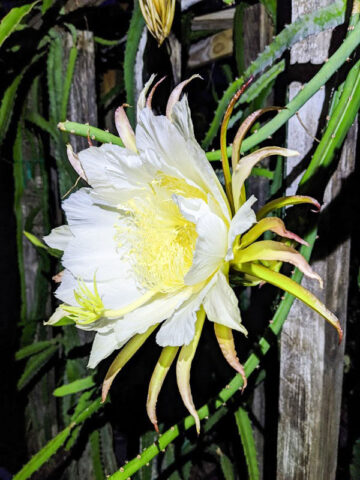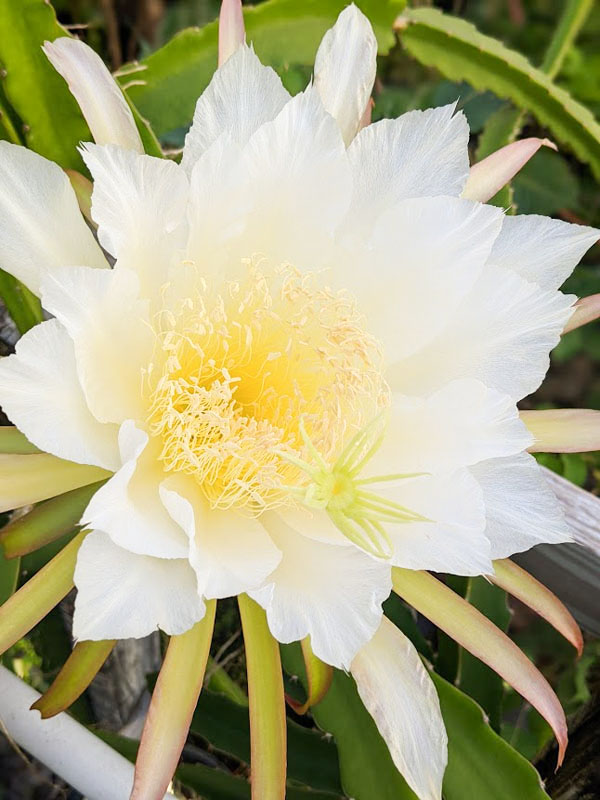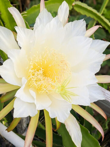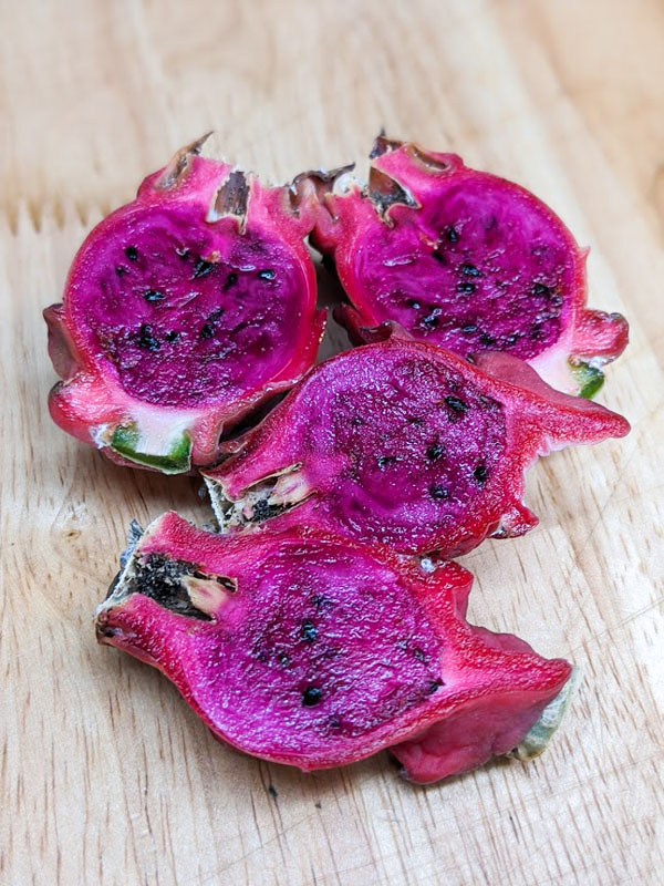 The bite size fruits produced by Neon Dragon Fruit are maroon with red tips in color with a red-magenta, delicious flesh inside that is edible and earthy. Neon is a wonderful mid-high yield, self pollinating variety, small in size weighing on average 0.4 – 0.7 lbs. Easily adapted to a variety of growing conditions and soils, this beautiful night blooming cactus produces fruit best when allowed to climb on a burlap wrapped totem, trellis or your favorite tree. The huge 10-16 inch round flowers are highly fragrant and beautiful in form, usually lasting just one night.