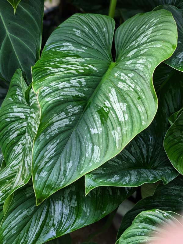 Mamei – This amazing silvery variegated leaf philodendron produces numerous heart shaped leaves on 10 to 12 inch stems. The leaf nodes on this plant are very tight and compact which makes a fuller plant. An excellent choice for indoor or patio containers. Though Mamei is actually a climbing variety it can maintain its bushy form by simply trimming it back once or twice per year. These are very healthy tropical plants with well established root systems. When mature the leaves are absolutely huge and the vine swells to over a half inch in diameter and the nodes shorten up to 1/2 inch creating a fuller appearance.