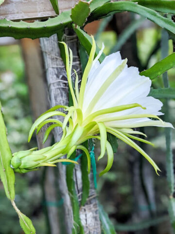 Sweet Pink Dragon Fruit Flowers can be a foot long and as much as 18 inches wide. The fruit produced is Super Sweet NEON Pink Dragon inside edible and sweet. Easily adapted to a variety of climates and soils this night blooming cactus is cultivated around the world in tropical regions for the fruit it bears. The white flowers are beautiful and usually last just one night where pollination is necessary to set fruit.