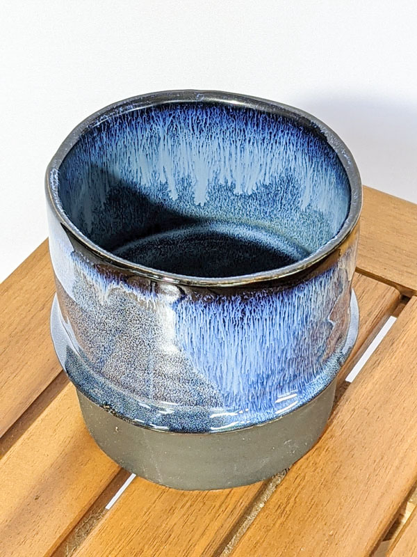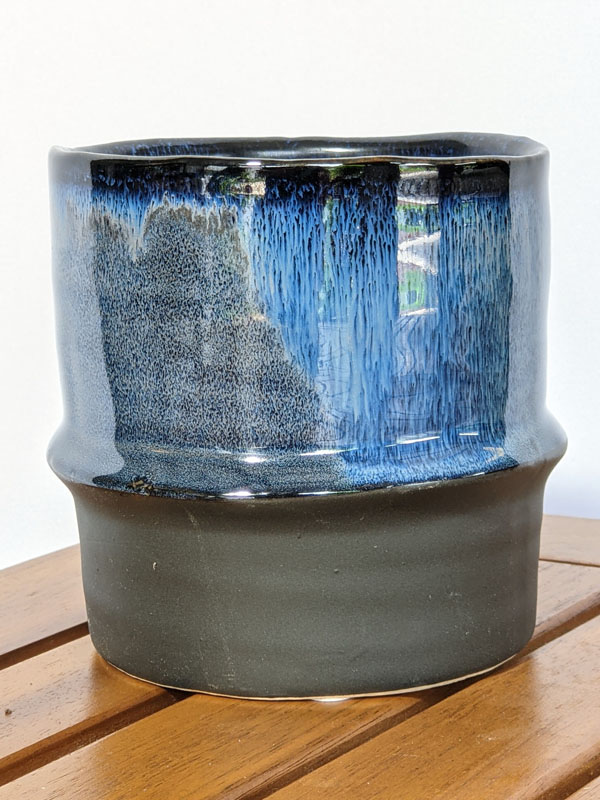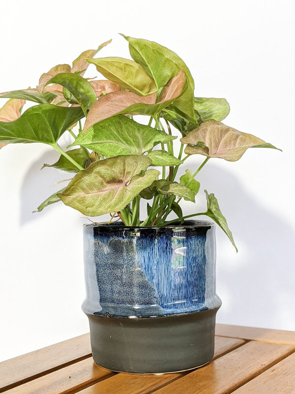 Awash in glossy tropical blue hues that gently meld into the slate flat finish at the bottom The Bermuda Blue is ready to liven up any indoor plantscape. An excellent colorful companion to dress up any of your Syngoniums (as shown) or other medium sized plants.